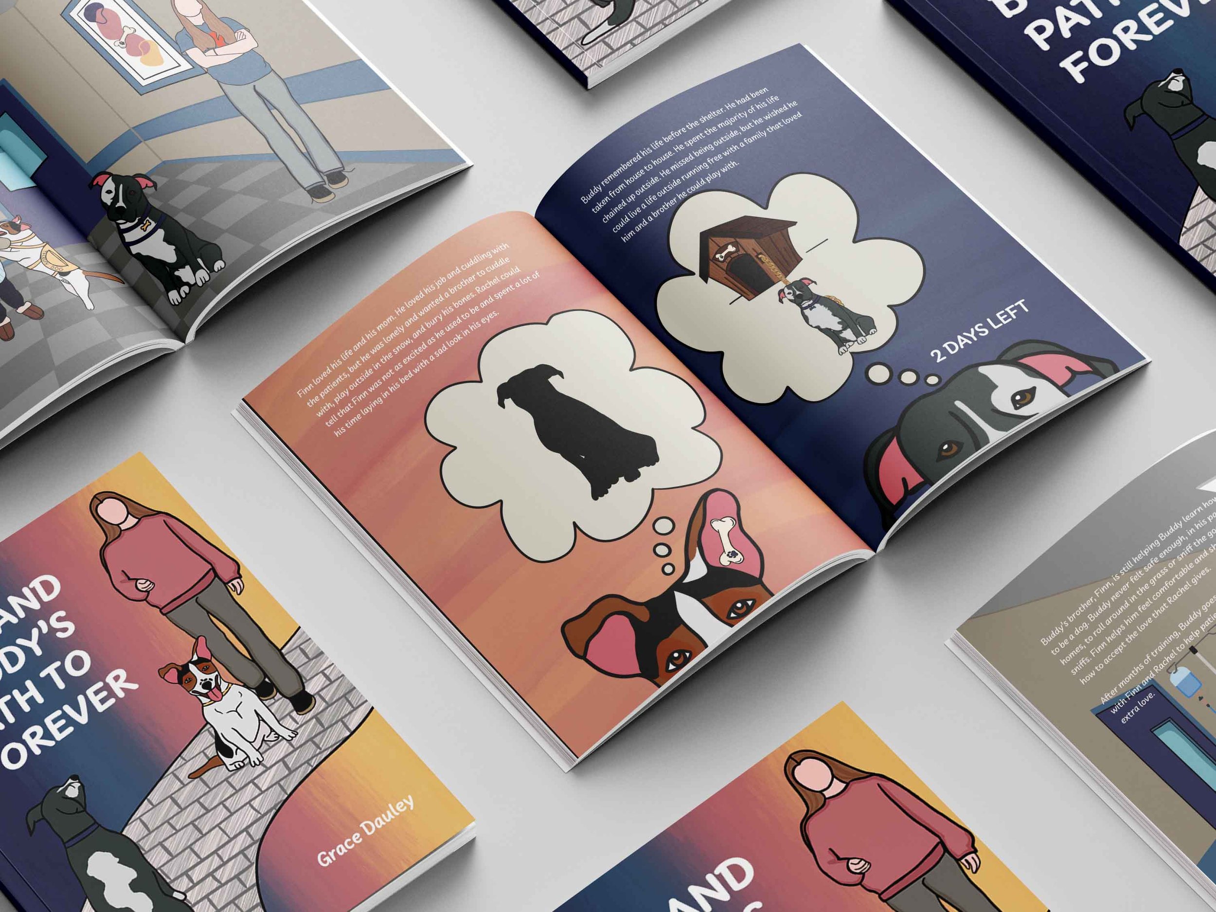 This assignment was my senior capstone project. We were tasked with coming up with our own project. One that had meaning and a message. I knew I wanted to create a book since I started Graphic design, so all I had to come up with was the message. I have always had a love for dogs and wanted some impact on how dogs are treated. Therefore, Finn and Buddy's path to forever was born. The biggest challenge with this project was coming up with how everything in the book was going to look. I wanted it to be very colorful and eye-catching and engaging for the target audience (10-14 year olds). I also struggled greatly with writing a story that was age appropriate and entertaining enough to continue reading. I was able to accomplish this by choosing two colors per dog that represent how each down is feeling/ represents and using that all throughout the book. I also worked very hard on the writing and had many drafts that eventually became what it is now.