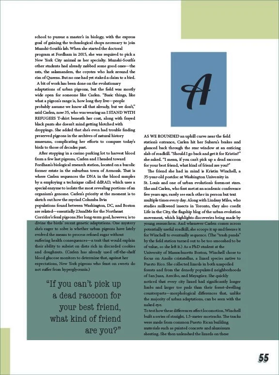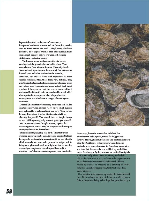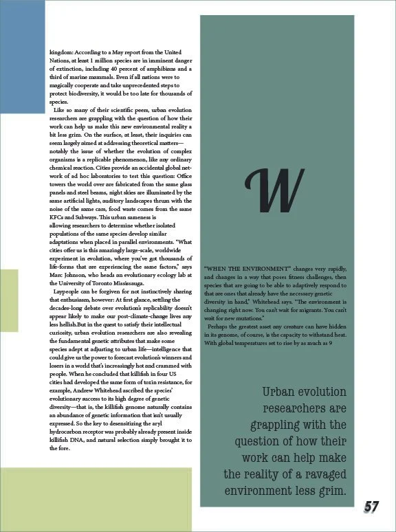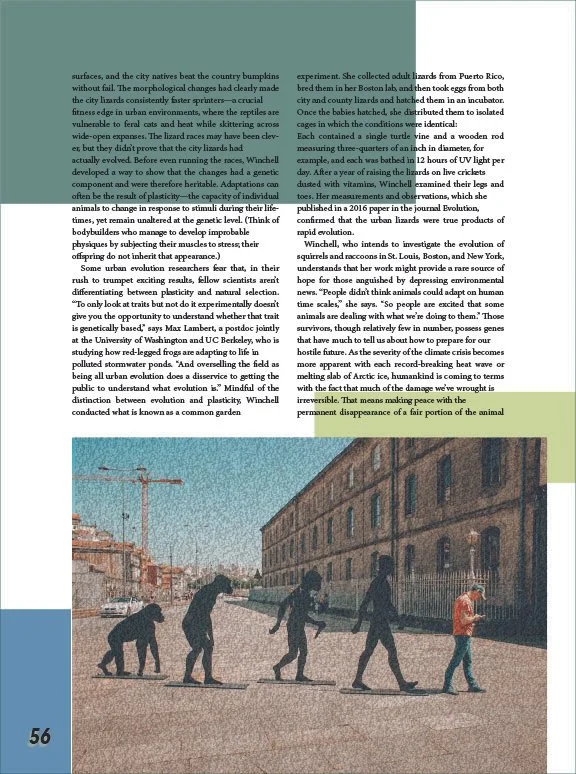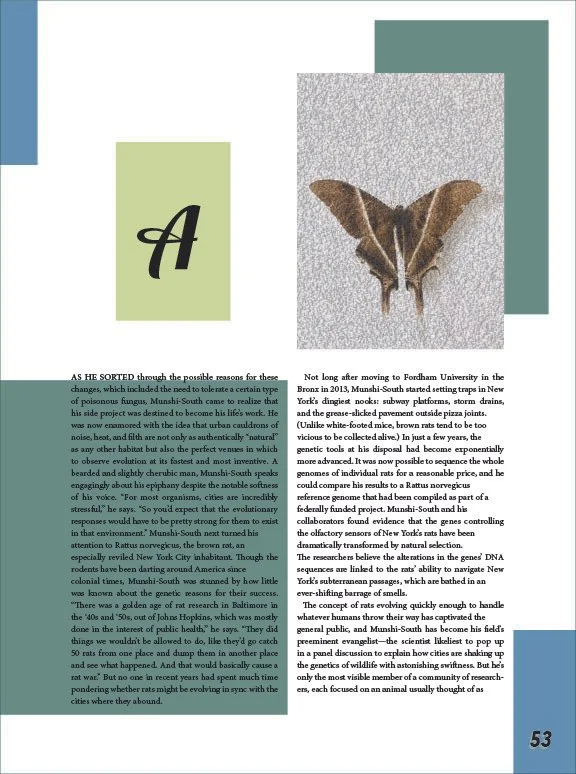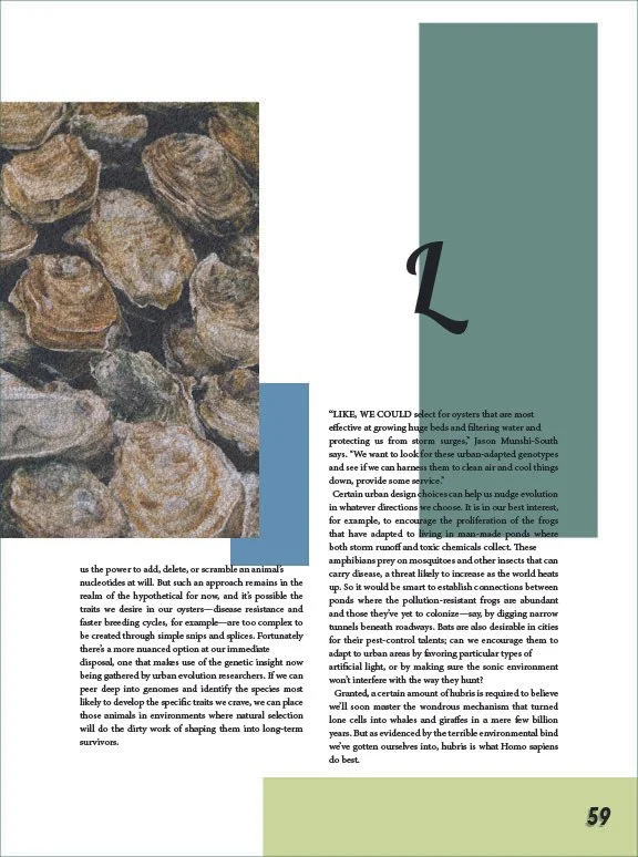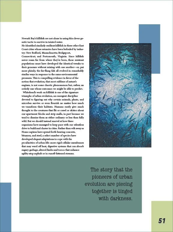 This project aimed to redesign a feature article and magazine cover design for Wired magazine. The layout has to adhere to Wired’s typographic standards, while the photos and other aspects of the article were up to my discretion. The challenge was trying to come up with photos and other elements that had a consistent feel throughout. It was challenging to develop components such as page numbers and page breaks that are all different while still looking cohesive. I chose to unify the article by applying a consistent color scheme and varied aspects such as white space, and accent typography to start the beginning of new sections. My design adds value by making the article visually engaging while still getting the main points across to the readers.